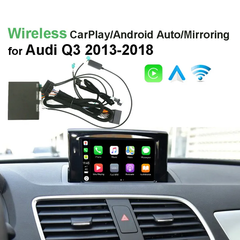 Applicable models: Q3 MMI2013-2018This wireless CarPlaydecodersupports:Apple Carplay&Android auto,original car microphone.Function:1)Wireless Apple CarPlay2) Wireless Android auto3) iOS AirPlay / Mirror-Link4)Rear camera( with reverse track)Optionnal:1) Udisk play--below 128G( music, video )2)Original steering wheel operation,knob operation,voice operation3)Rear view camera( with reverse track)Notice:1) Before purchasing, pleaseconfirm your Q3 is original car nonavigation.2) Before installing, please make sure that your car's aux is activated.3) The product support upgrade firmware, one years of warrantly.FAQ:1.My caris Q3. Will this kit fit my car?Yes , this Wiresless CarPlay kit both supports Audi Q3 with/withoutoriginal navigation .2.My car has AMI (Music Interface). Will this fit my car?Yes, it will fit all Q3 models with or without AMI.3.Will I have to change my original car screen or make wiring modifications?This kit allows retain the factory fitted display screen in your car, and all wiring is plug and play, so no cutting wires etc.4.Will sound come out of my Audi radio?Yes, this unit will allow music playback, and all sounds to be emitted through the car speakers, simply switch theradioto 'AUX' source mode for playback.5.How do I plug in my iPhone?Thiswireless kit both supports wireless&wired connection, you can connect via Bluetooth or the USB port.The product has its own dedicated USB port -simply route this to a location of your preference, and plug in a genuine Applelightningcableto attach your phone. Dear friend:Now the wireless CarPlay kit supports both iphone and Android phone( Released on 30th, March ).But we can't 100% guarantee that this wireless Android auto supports all Android phones,it only fits a parts of Android brand phones. Meanwhile this CarPlay kit also supports wiredAndroid auto connection.Wireless Android Auto fits on Android phone model:1.Samsung Galaxy s8/note 8/s9/s9+2.Sony xperia x21 / X2z3.LG G6/V304.HTC u115.Google Pixel 2/3 Audi q3 wireless CarPlay, q3 carplay